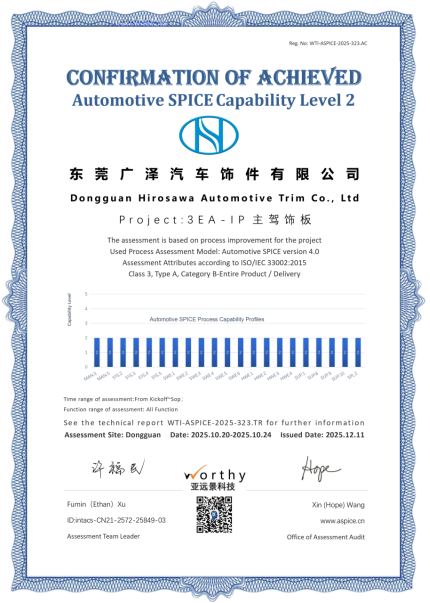 东莞广泽通过ASPICE CL2评估,不仅是对自身研发管理能力的肯定,也为与主机厂及国际客户的合作提供了重要资质背书。在汽车智能化、网联化快速发展的背景下,ASPICE已成为全球主流车企对供应商软件开发过程能力的核心要求之一。通过此评估,意味着东莞广泽在汽车内饰件的软件开发与系统集成领域,已具备符合国际标准的过程管理能力。