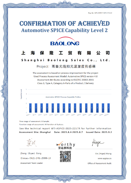 近日,上海保隆工贸有限公司(以下简称保隆科技)雨量光线阳光温湿度传感器(以下简称光雨量传感器)项目正式通过ASPICE CL2国际权威评估。这是保隆科技继TPMS、智能悬架控制器之后,再次通过该评估。保隆科技董事长兼总裁张祖秋出席授证仪式,INTACS认证首席评估师侯亚文为保隆科技颁发证书。这标志着保隆科技的软件开发体系全面接轨国际标准,为拓展全球高端市场奠定关键基石。