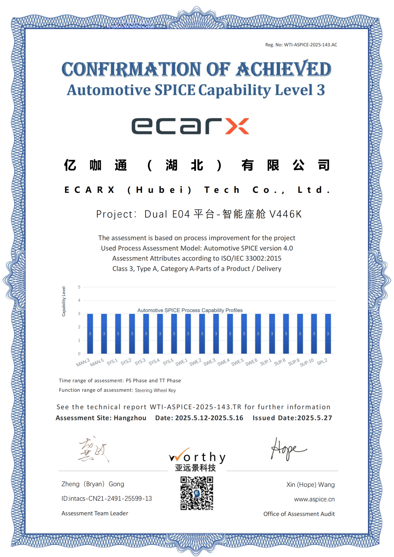 近日,全球出行科技提供商亿咖通宣布,其Dual E04平台-智能座舱V446K项目已通过汽车软件性能改进及能力测定(Automotive SPICE,简称ASPICE)v4.0能力级别3(CL3)评估——这是当前ASPICE标准下能达到的最高评级。此次评估彰显了其致力于构建稳健、全面合规的基础设施,以此作为加速全球扩张和持续创新的基石。