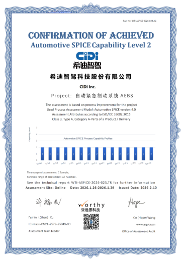 近日,希迪智驾(CiDi)正式通过Automotive SPICE® 4.0版本过程能力2级(CL2)评估,标志着希迪智驾在智能驾驶系统软件开发与过程管理领域迈上了标准化、规范化的新台阶。